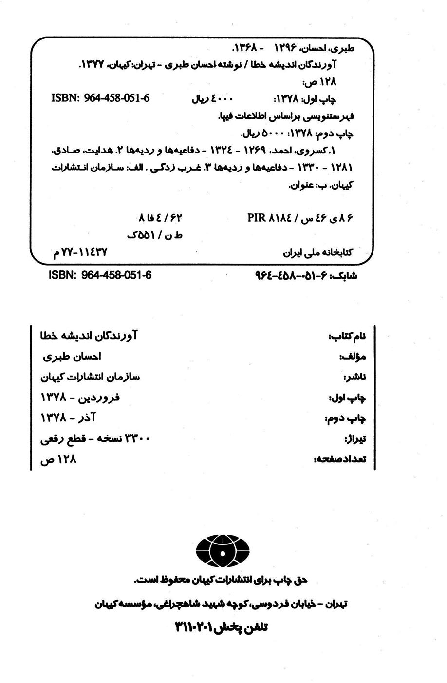 🔖 book_keywords : دانلود فایل pdf آورندگان اندیشه خطا: سیری در احوال صادق هدایت و احمد کسروی نوشته احسان طبری