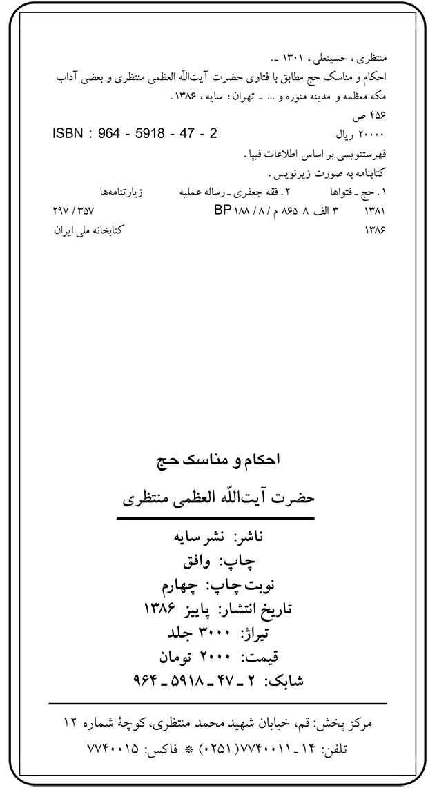 احکام و مناسک حج و بعضی آداب مکه معظمه و مدینه منوره و زیارات و ادعیه مأثوره، حاوی فتاوای آیت‌الله حسینعلی منتظری، درباره حج و مسائل مربوطه، به زبان فارسی است …