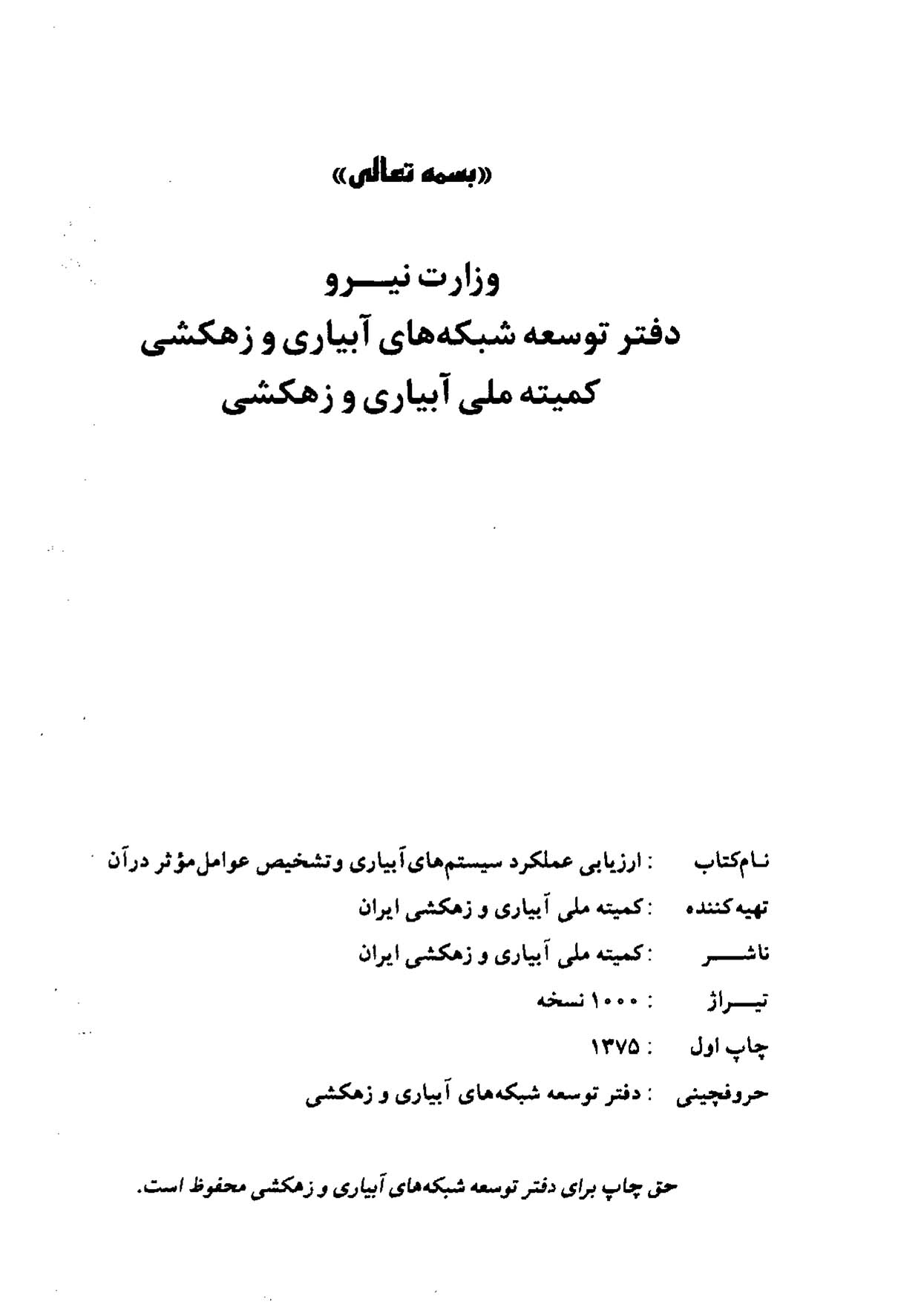 این کتاب یکی از معدود کتابهایی است که دست اندرکاران مسائل آبیاری زهکشی در دهه اخیر انتظار چاپ و انتشار آن را داشتند. شبکه های آبیاری و زهکشی در نقاط مختلف کشور احداث گردیده و هم اکنون نیز با سرعت زیادی در حال انجام می باشد.