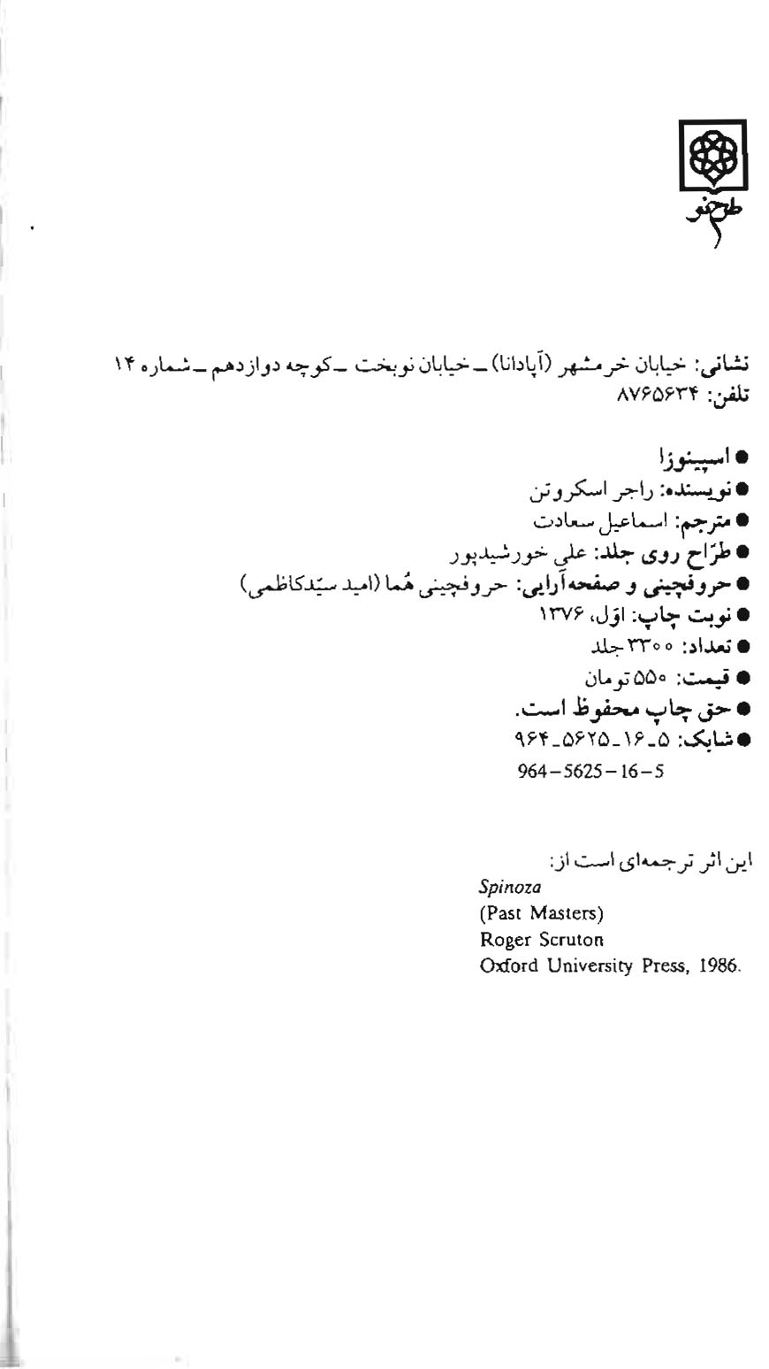 کتاب اسپینوزا نوشته راجر اسکروتن می باشد و توسط اسماعیل سعادت ترجمه گشته است.اثر فوق در سال هزار و سیصد و هفتاد و شش به چاپ رسیده و در انتشارات طرح نو چاپ گشته است.این نوشته با زبان فارسی و دارای تعداد صد و پنجاه و هفت صفحه است.