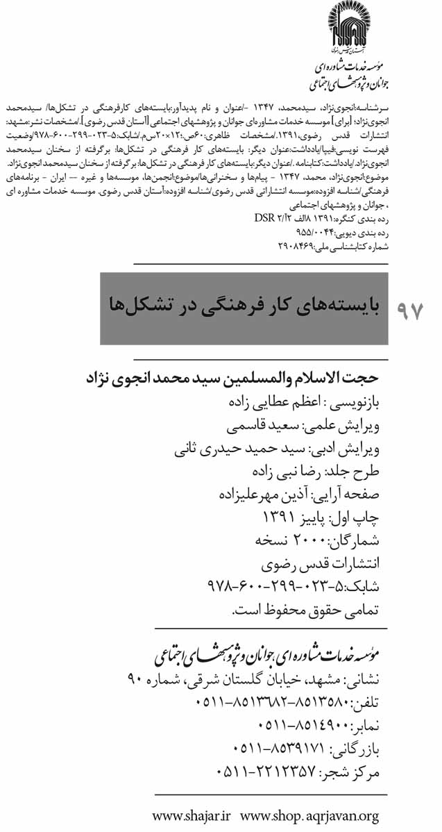 بایسته های کار فرهنگی مطلوب، باسته های برنامه ریزی در کار فرهنگی، بایسته های گروه هدف در کار فرهنگی، کار فرهنگی در تشکل ها و آسیب شناسی آن، سرفصل های این اثر است که توسط انتشارات موسسه خدمات مشاوره ای و پژوهش های اجتماعی در قطع پالتویی چاپ و منتشر شده و در نوزدهمین نمایشگاه بین المللی ناشران جهان اسلام و هشتمین نمایشگاه ملی کتاب و دفاع مقدس در معرض بازدید عموم قرار گرفته است.