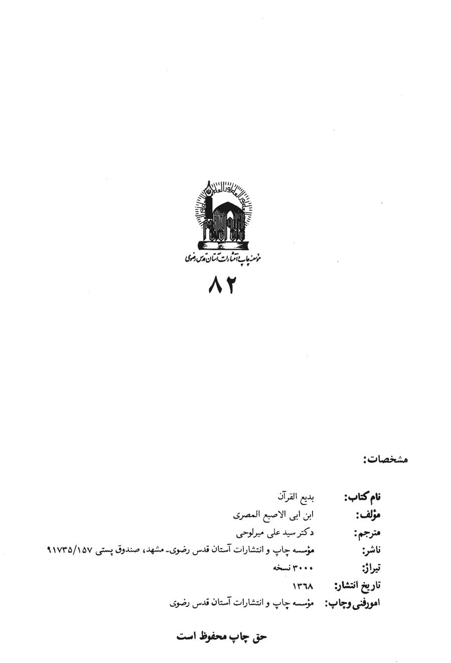 ناشر: موسسه چاپ و انتشارات آستان قدس رضوی