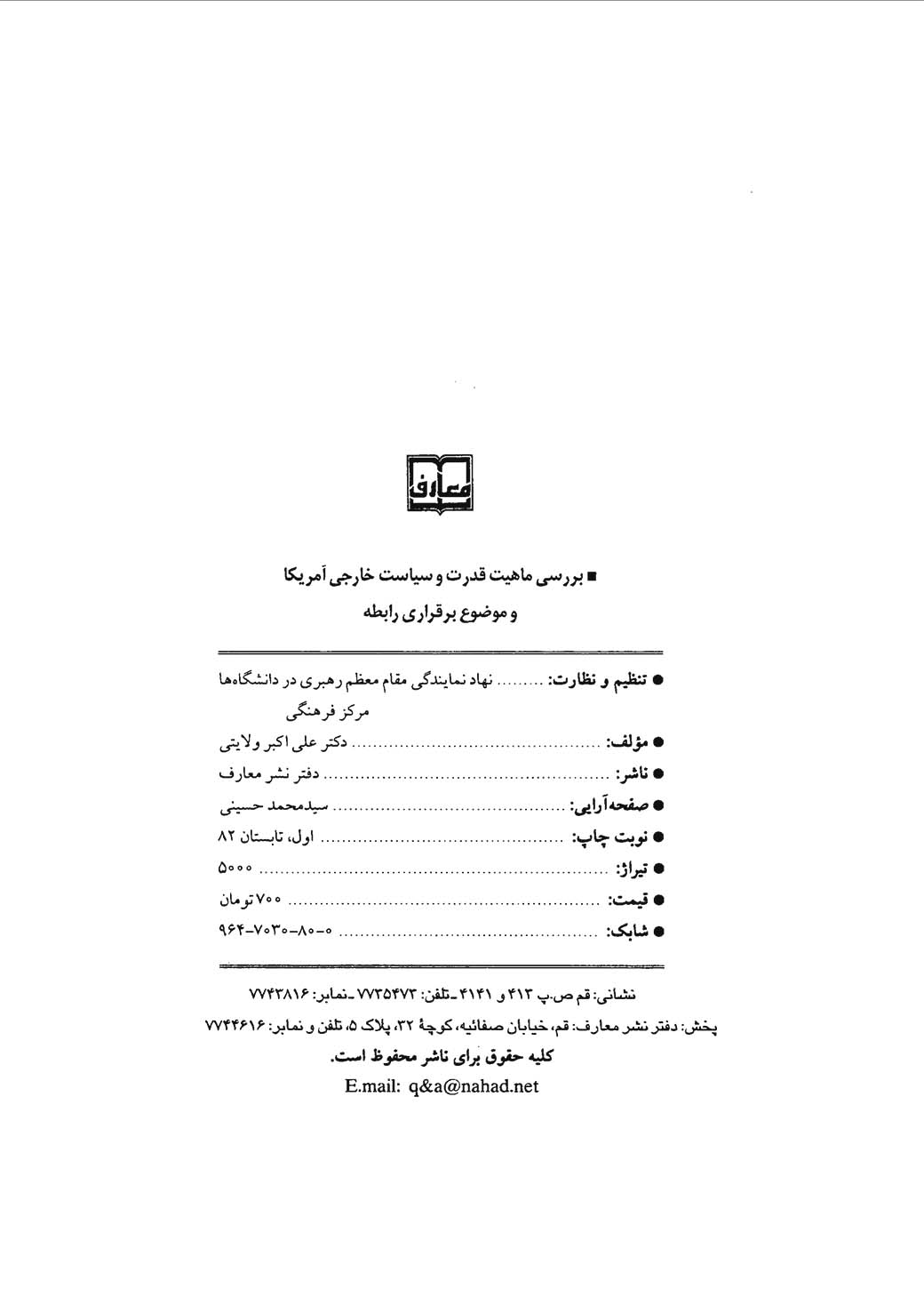 🔖 book_keywords : دانلود فایل pdf بررسی ماهیت قدرت و سیاست خارجی آمریکا و موضوع برقراری رابطه نوشته علیاکبر ولایتی