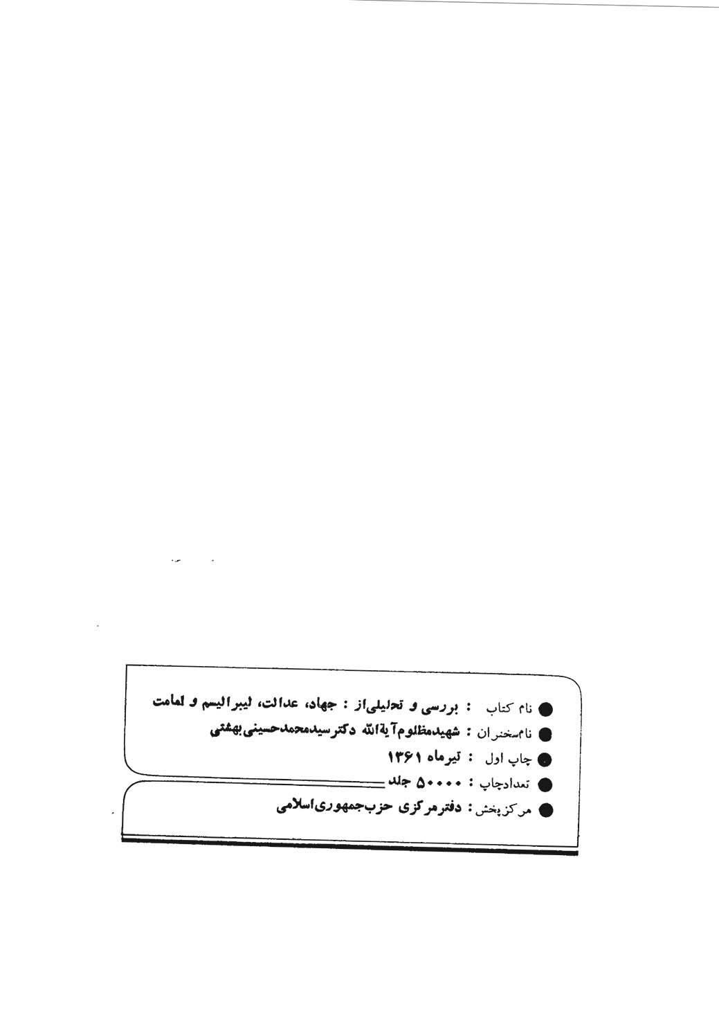 بررسی و تحلیلی از: جهاد، عدالت، لیبرالیسم و امامت، مجموعه سخنرانی‌های شهید سید محمد حسینی بهشتی (۱۳۰۷-۱۳۶۰ش) است که بعد از پیروزی انقلاب اسلامی و در مناسبت‌های مختلف ایراد گردیده است.