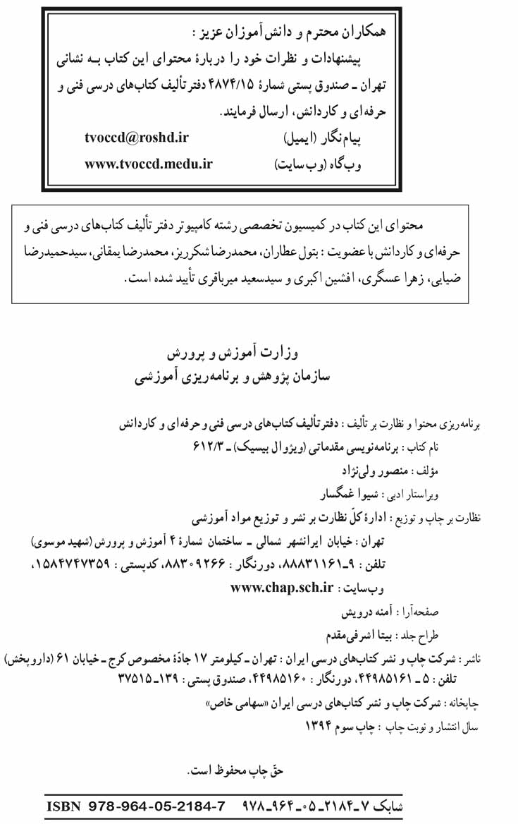 🔖 book_keywords : دانلود فایل pdf برنامه نویسی مقدماتی (ویژوال بیسیک) سال ۱۳۹۴ نوشته مؤسسه فرهنگی هنری دیباگران تهران