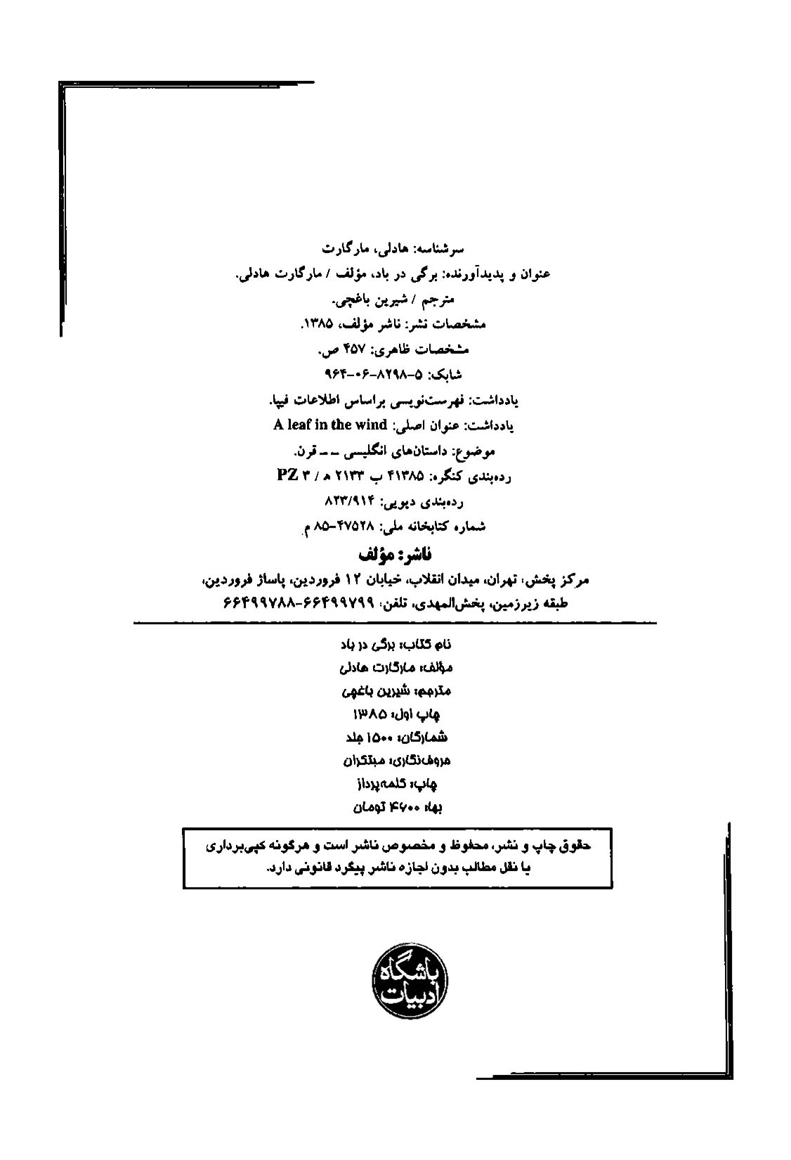 🔖 book_keywords : ردۀ دیویی: ۸۲۳ (برای داستان انگلیسی), fanuus, دانلود کتاب برگی در باد, pdf برگی در باد, برگی در باد نوشته مارگارت هدلی ترجمه شیرین باغچی