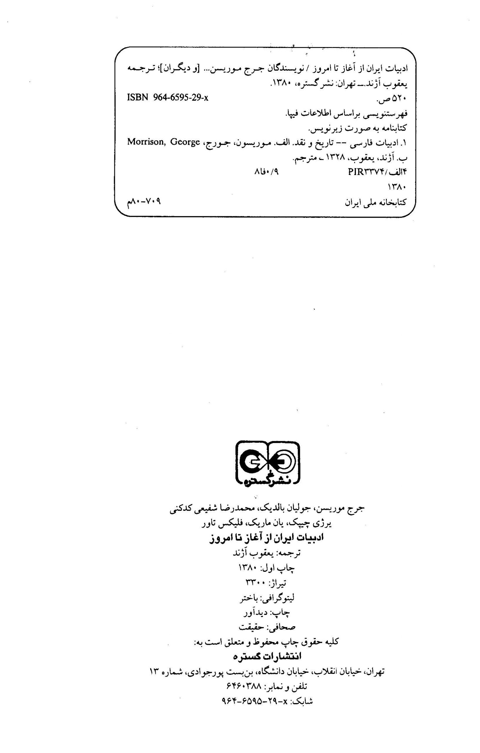 ۱ : کتاب “تاریخ ادبیات فارسی از صدر اسلام تا به امروز (HISTORY OF PERSIAN LITERATURE FROM THE BEGINING ” OF THE ISLAMIC PERIOD TO THE PRESENTDAY) با ویراستاری “جرج موریسون “که مولفان آن خود موریسون، “جولیان بالدیک “و “دکتر محمدرضا شفیعی کدکنی “هستند .گفتنی است موریسون ادبیات ایران را از آغاز اسلام تا دوره “جامی “به گونه درسنامهای، همچنین مراحل مختلف نظم و نثر فارسی را بررسی کرده است” .