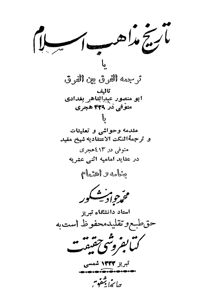 ابومنصور عبدالقاهر بغدادی یا ترجمه الفرق بین الفرق با مقدمه و حواشی و تعلیقات و ترجمه النکت الاعتقادیه شیخ مفید