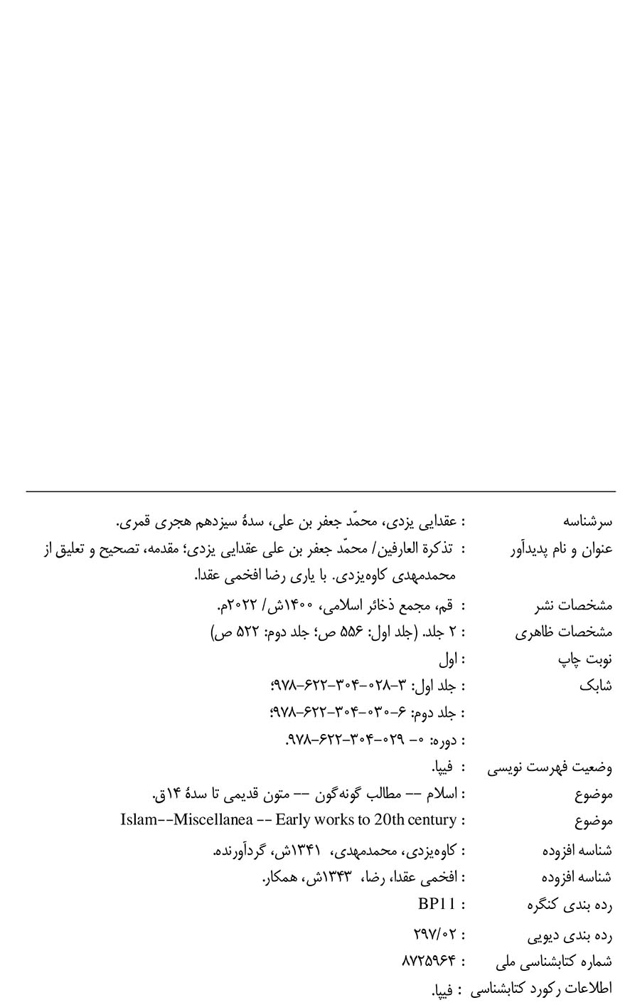 🔖 book_keywords : دانلود فایل pdf تذکره العارفین (جلد اول) نوشته محمدجعفر بن علی عقدایی یزدی
