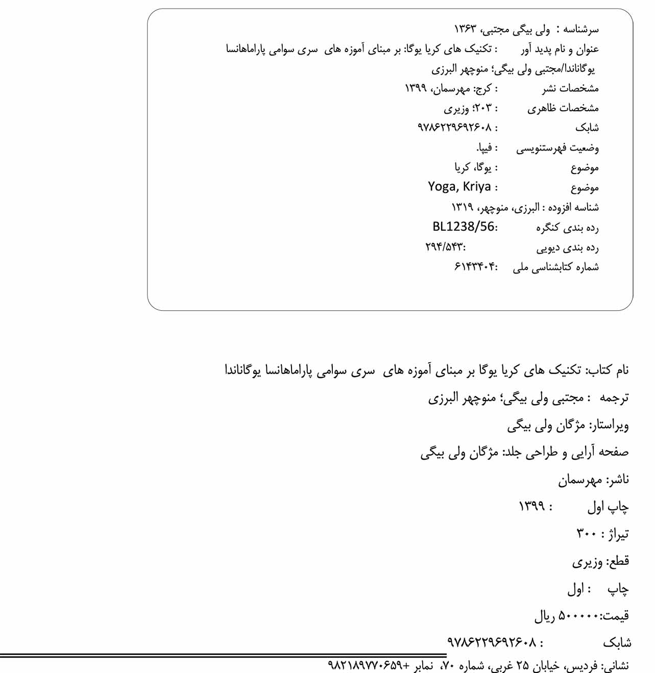 عنوان و نام پدیدآور تکنیک‌های کریا یوگا : بر مبنای آموزه‌های سری سوامی پاراماهانسا یوکاناندا/مجتبی ولی‌بیگی، منوچهر البرزی.