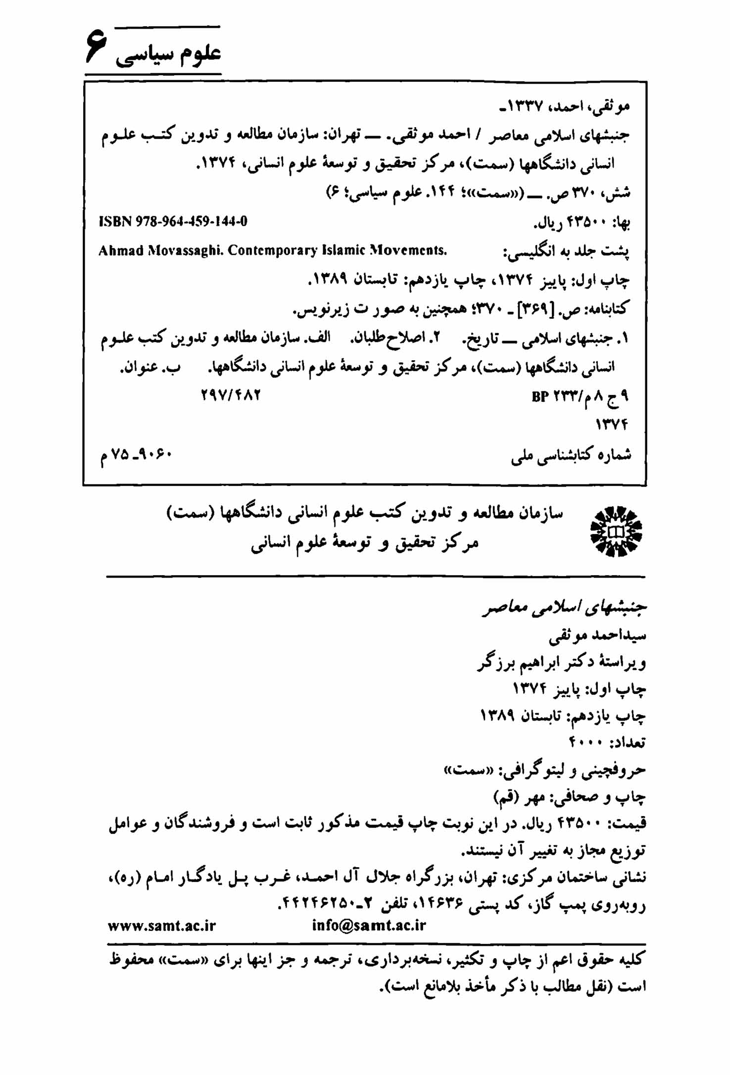 یادداشت پشت جلد به انگلیسی: Ahmad Movassaghi. Contemporary islamic movements.