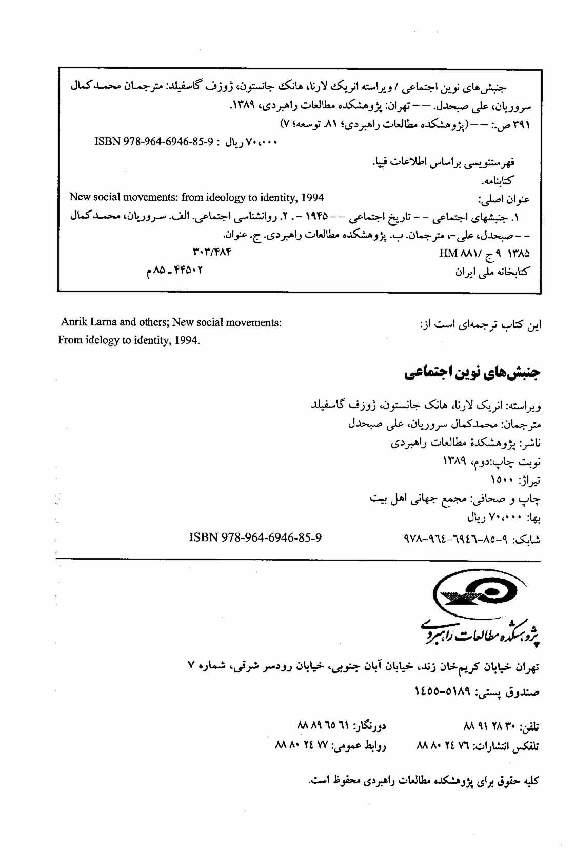 عنوان و نام پدیدآور جنبش‌های نوین اجتماعی/ویراسته انریک لارنا، هانک جانستون، ژوزف گاسفیلد ؛ مترجمان محمدکمال سروریان، علی صبحدل.