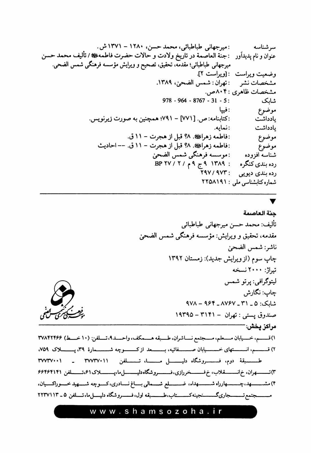 🔖 book_keywords : دانلود فایل pdf جنه العاصمه در تاریخ ولادت و حالات حضرت فاطمه (س) نوشته سید محمد حسن میر جهانی