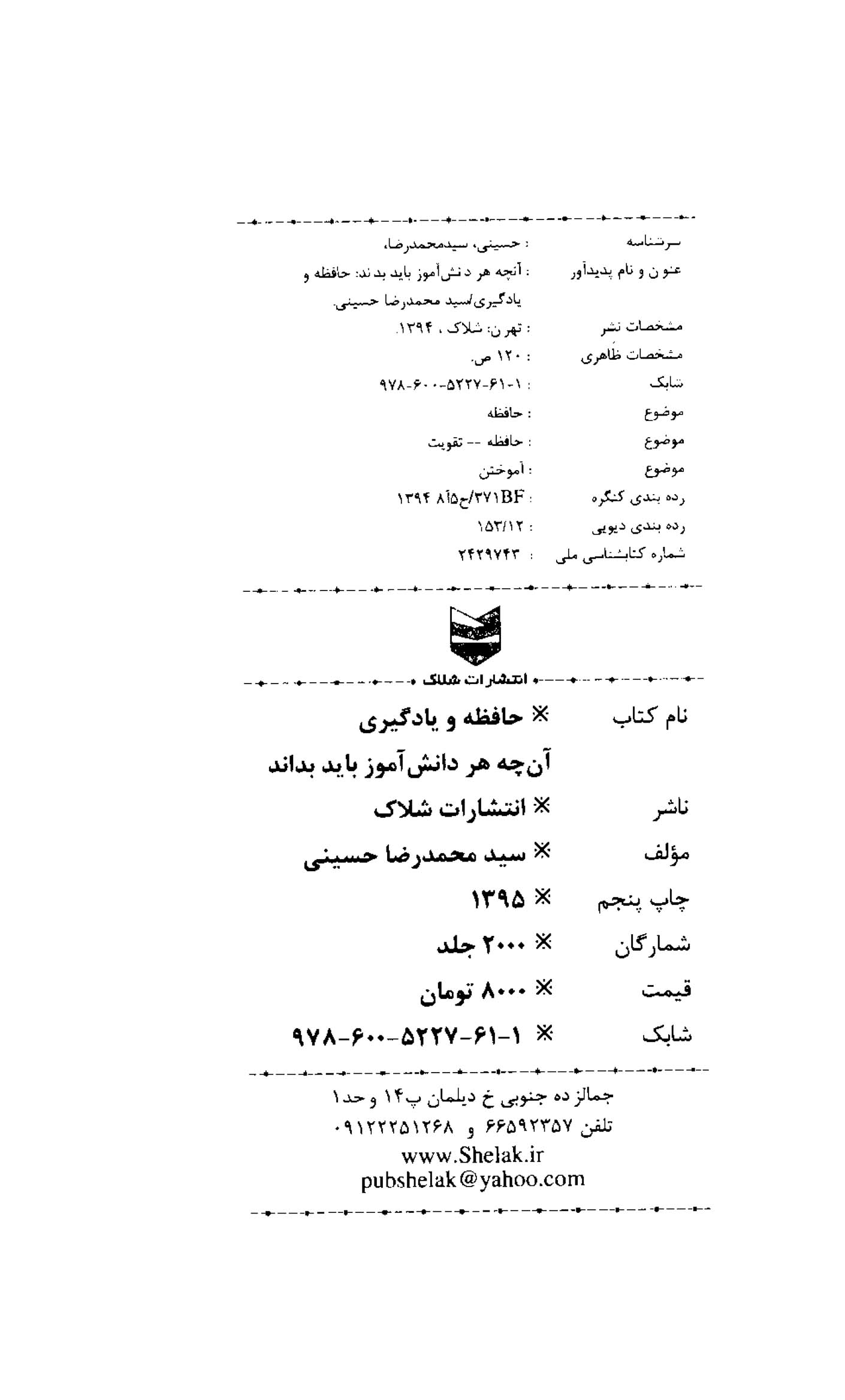 🔖 book_keywords : دانلود فایل pdf آنچه هر دانشآموز باید بداند: حافظه و یادگیری نوشته سیدمحمدرضا حسینی