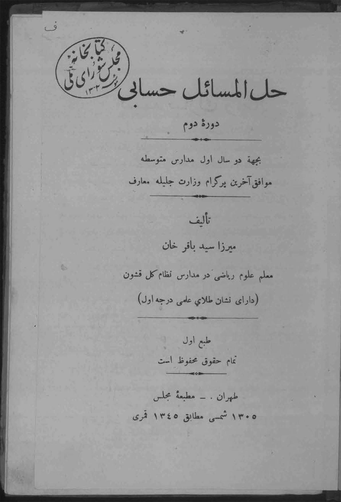 🔖 book_keywords : دانلود فایل pdf حل المسائل حسابی نوشته میرزا سید باقر خان