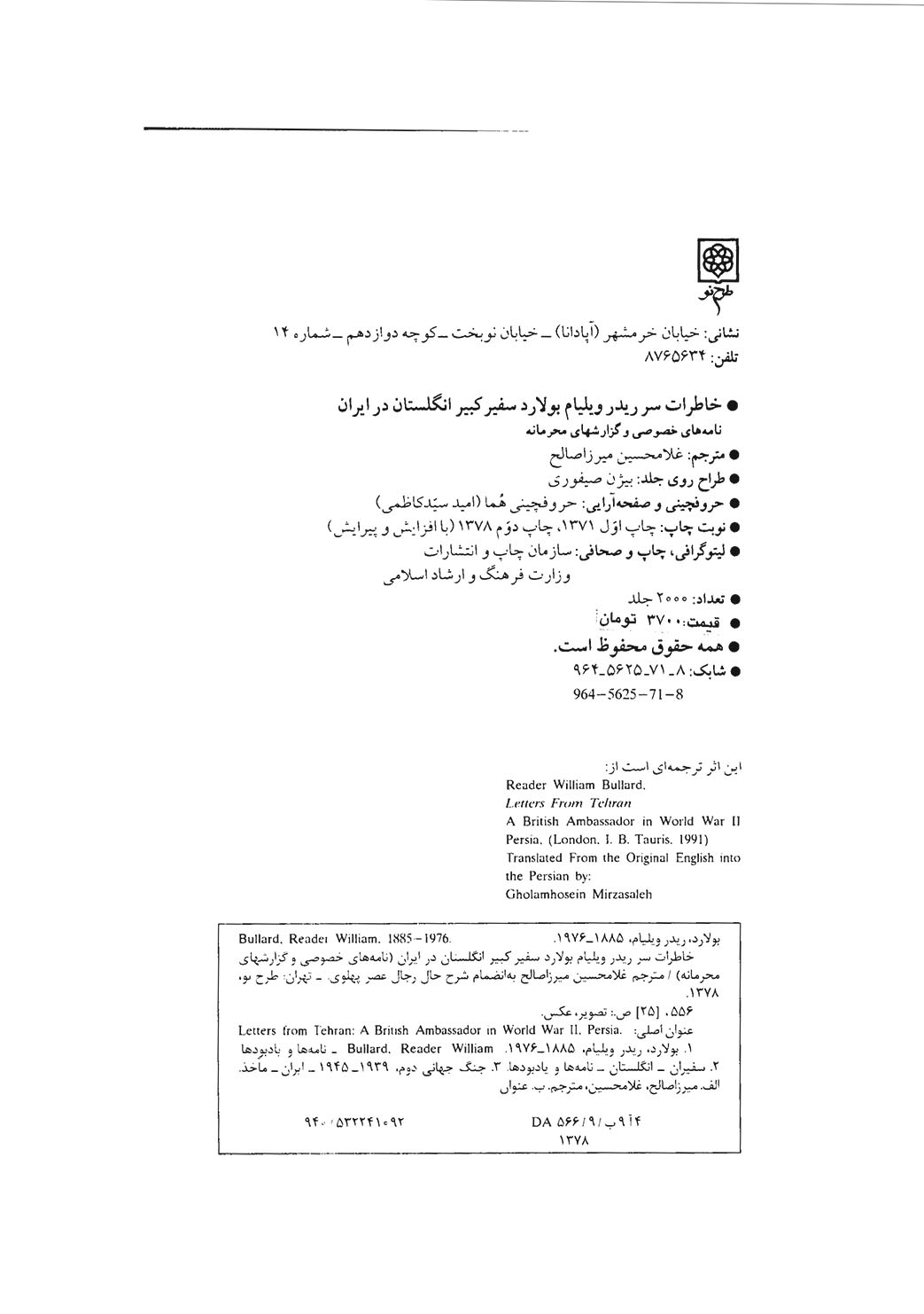 خاطرات سر ریدر ویلیام بولارد سفیر کبیر انگلستان در ایران: نامههای خصوصی و گزارشهای محرمانه بهانضمام شرح حال رجال عصر پهلوی