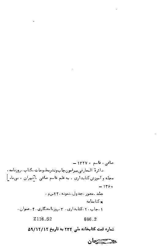آنچه در این دفتر فراهم آمده است در سه بخش عمده مراحل چاپ یک اثر روش فهرست نویسی آن اثر و روش طبقه بندی است که برابر آخرین روشهای معمول در کتابخانه های دنیا تنظیم گشته است.