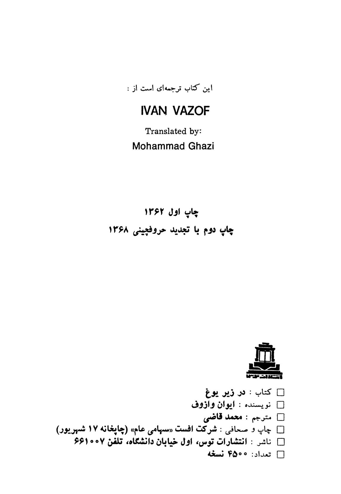 🔖 book_keywords : دانلود فایل pdf در زیر یوغ نوشته ایوان وازوف ترجمه محمد قاضی