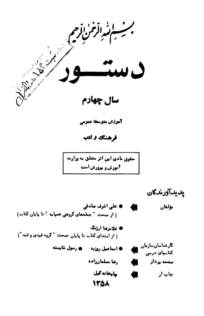 این کتاب دستورزبان فارسی برای کلاس چهارم آموزش متوسطه عمومی در سال ۱۳۵۸ تدوین شده است.