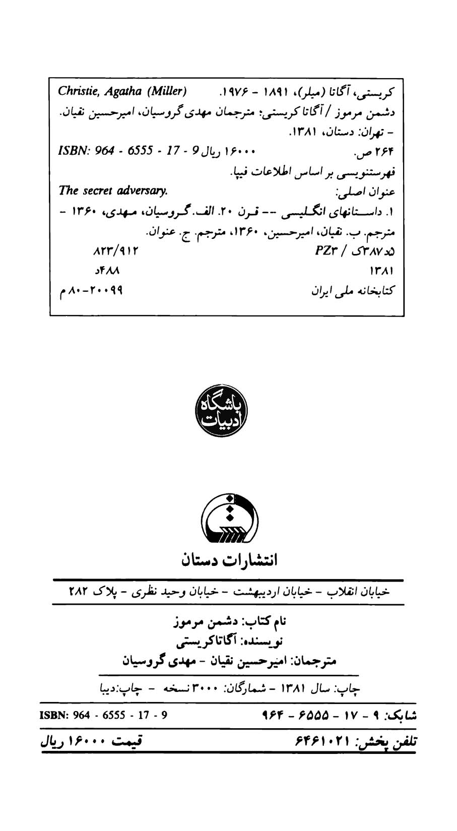 عنوان و نام پدیدآور دشمن مرموز/ آگاتا کریستی‌؛ ترجمه امیرحسین نقیان‌، مهدی گروسیان‌.