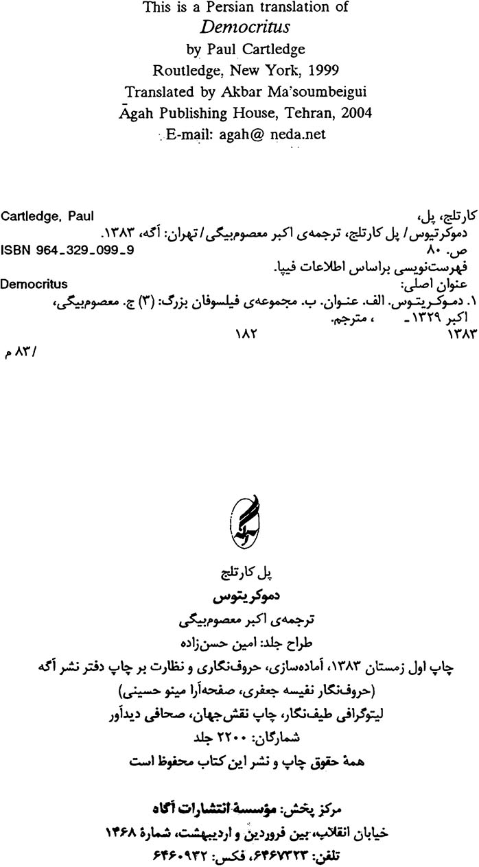 عنوان و نام پدیدآور دموکریتوس‌/ پل کارتلج‌؛ ترجمه‌ی اکبر معصوم بیگی‌