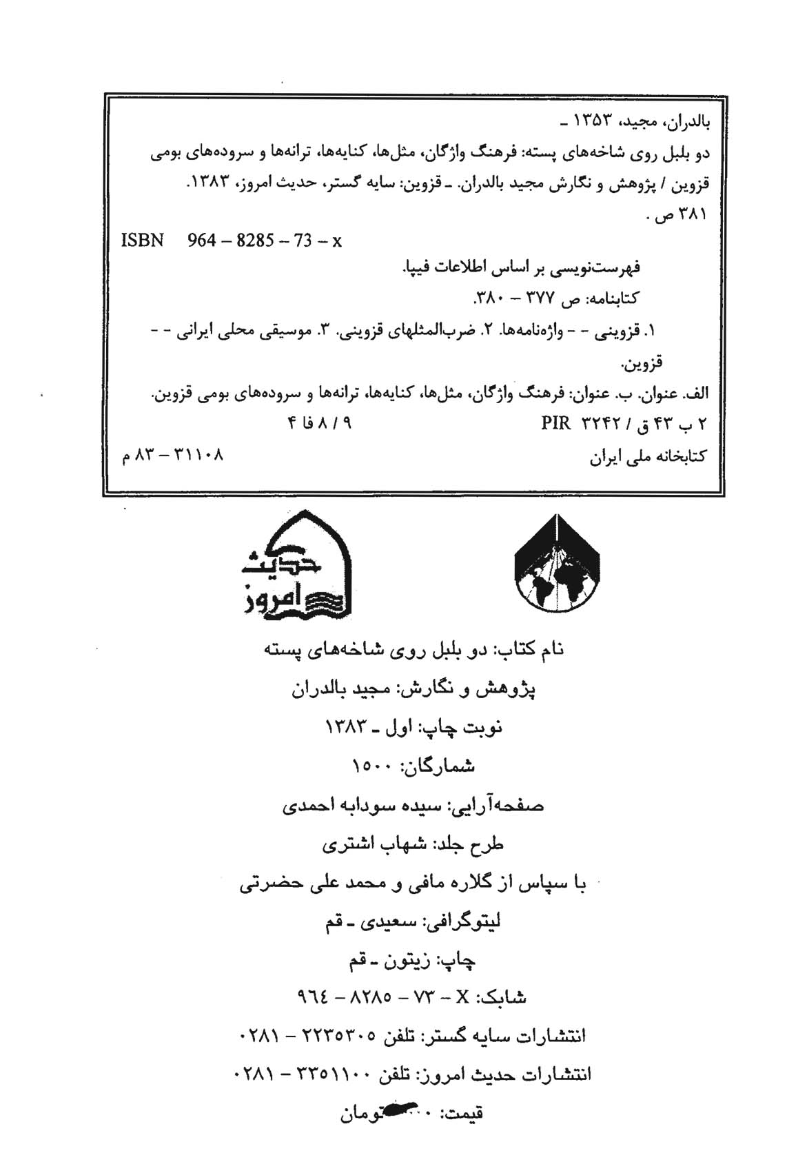 دو بلبل روی شاخههای پسته: فرهنگ واژگان، مثلها، کنایهها، ترانهها و سرودههای بومی قزوین