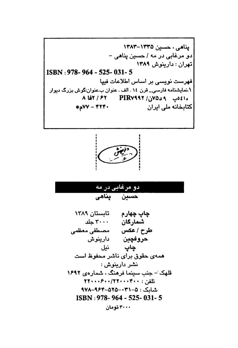 یادداشت پشت جلد به‌انگلیسی‌: Houssein Panahi. Play: Two dueks in the mist.