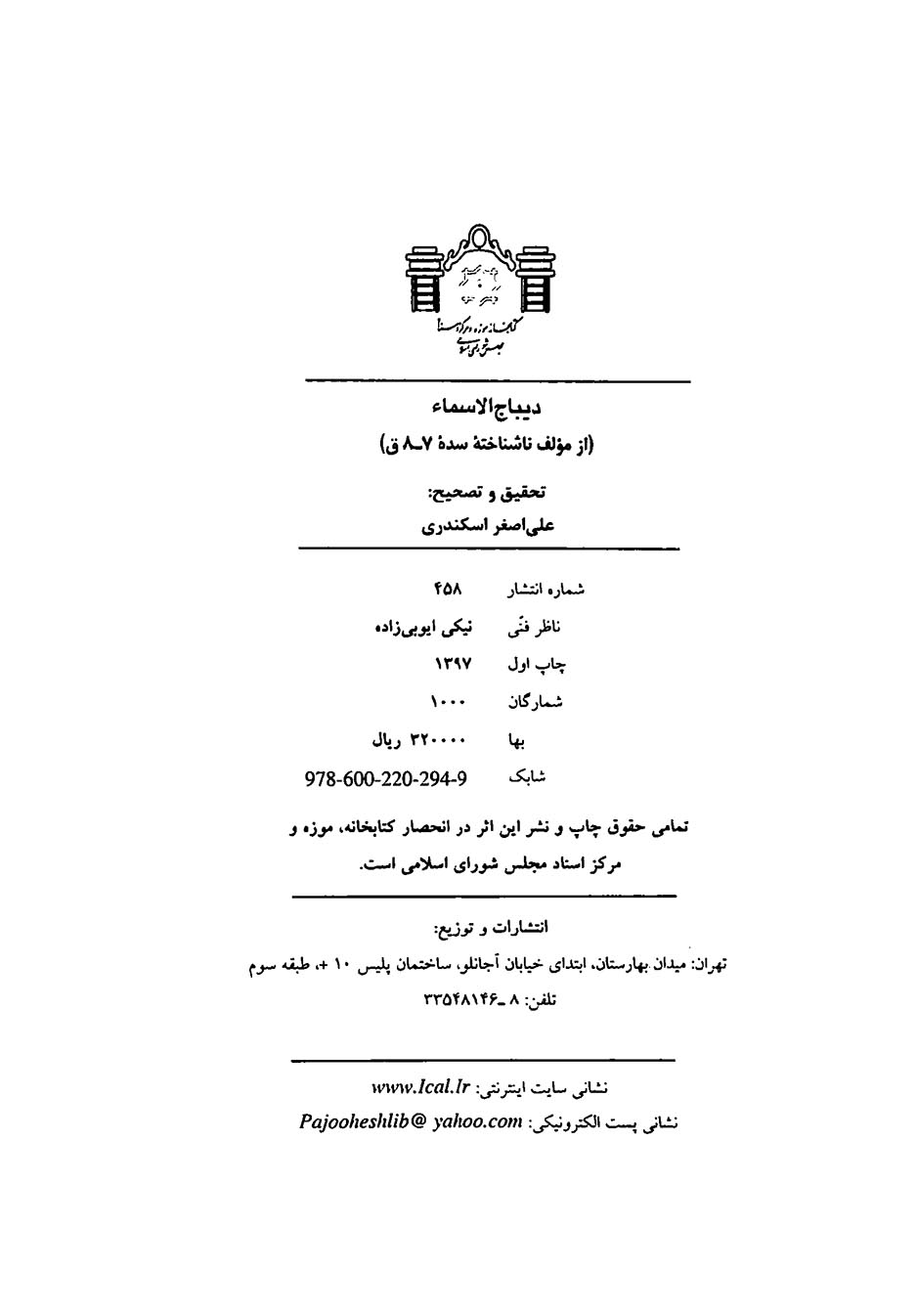 🔖 book_keywords : دانلود فایل pdf دیباج الأسماء نوشته ناشناخته ترجمه با تحقیق و تصحیح علی‌اصغر اسکندری