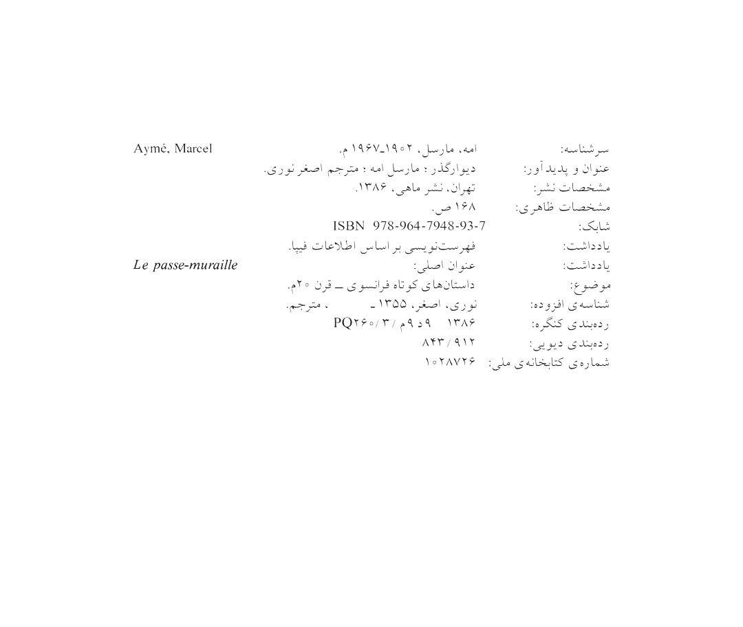 عنوان و نام پدیدآور دیوار گذر: پنج داستان کوتاه/ مارسل امه؛ مترجم اصغر نوری.