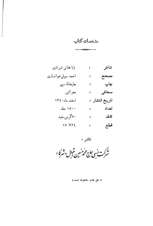 این کتاب مجموعه اشعار (دیوان) بابا فغانی شیرازی، از شاعران برجسته قرن نهم هجری و از پیشگامان سبک وقوع، است. اثر حاضر شامل غزلیات و قصایدی است که منبعی ارزشمند برای شناخت شعر آن دوره است.