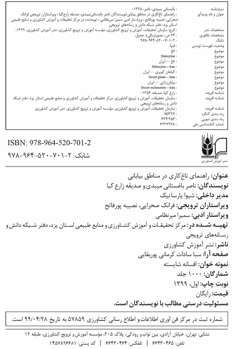 مشخصات نشر کرج: سازمان تحقیقات، آموزش و ترویج کشاورزی، معاونت ترویج، نشر آموزش کشاورزی، 1399.