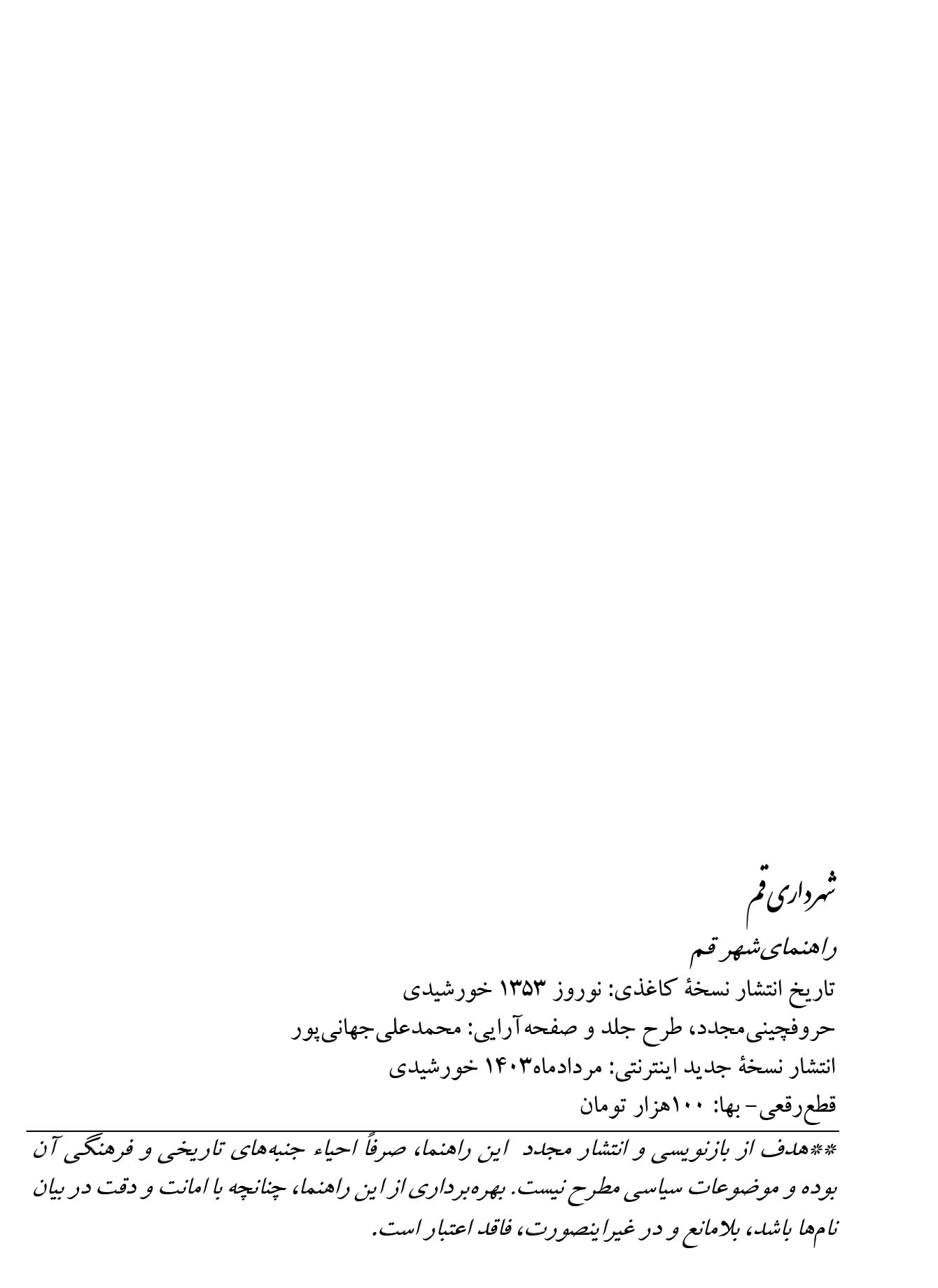 🔖 book_keywords : دانلود فایل pdf راهنمای شهر قم – نوروز ۱۳۵۳ خورشیدی نوشته تهیه و تنظیم: حسین قاسمی نژاد، شهردار قم