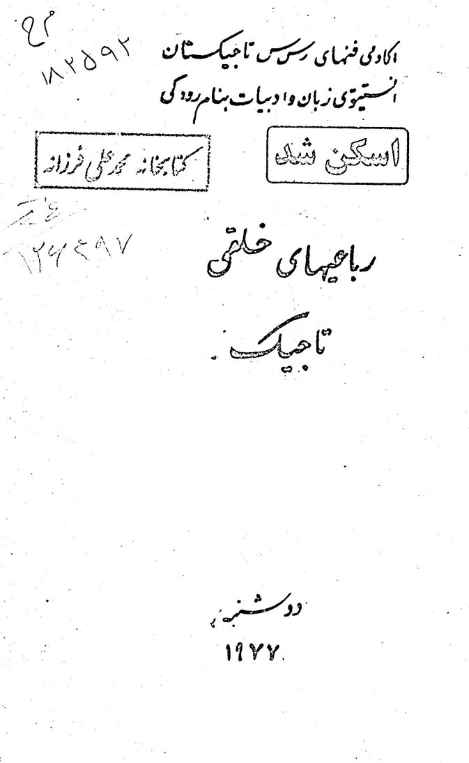 🔖 book_keywords : دانلود فایل pdf رباعیهای خلقی تاجیک نوشته ادوارد الکساندروویچ شوارتس ترجمه ترتیب دهنده نسخهها: ی. الغزاده