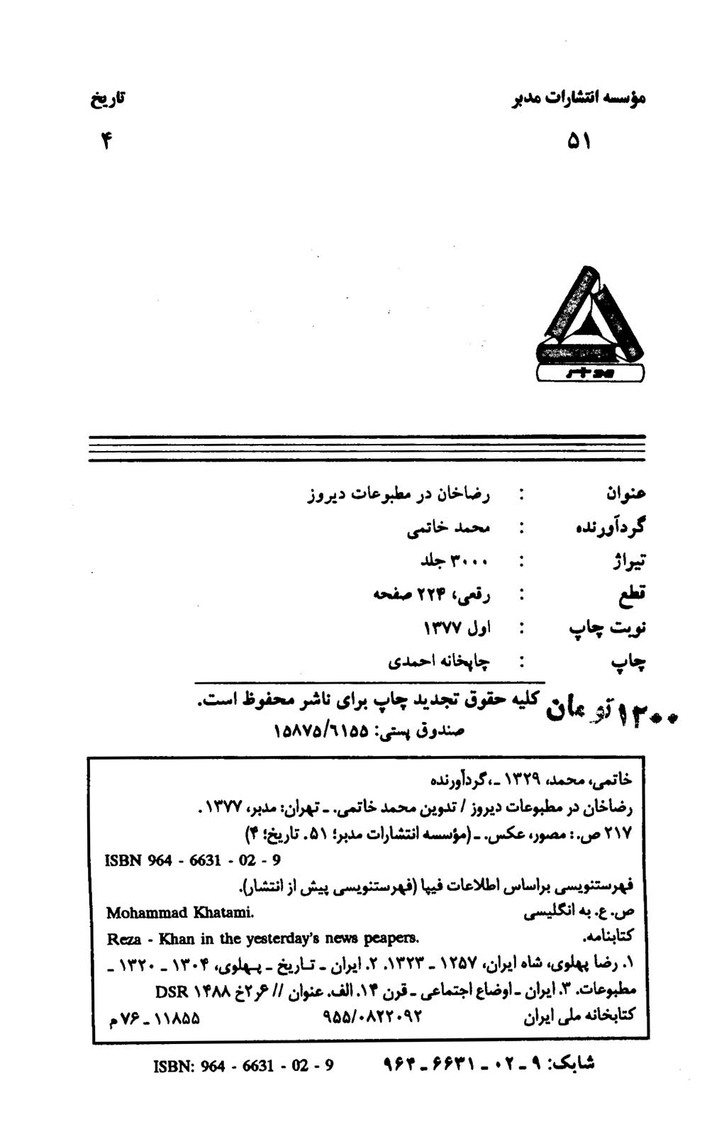 🔖 book_keywords : دانلود فایل pdf رضاخان در مطبوعات دیروز نوشته محمد خاتمی