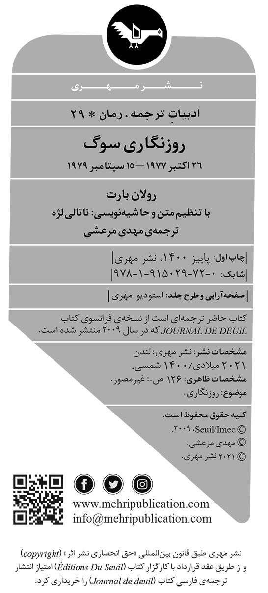 🔖 book_keywords : دانلود فایل pdf روزنگاری سوگ: ۲۶ اکتبر ۱۹۷۷ – ۱۵ سپتامبر ۱۹۷۹ نوشته رولان بارت ترجمه مهدی مرعشی