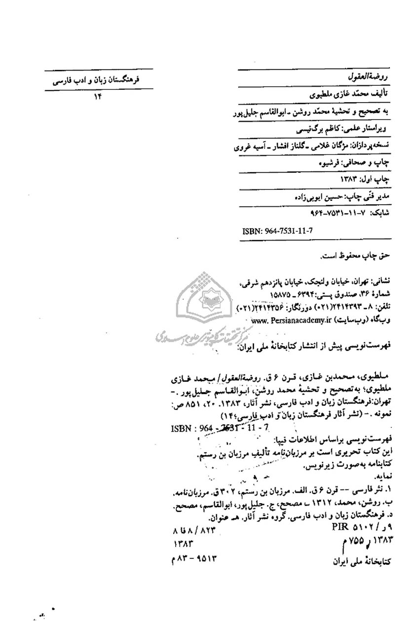🔖 book_keywords : دانلود فایل pdf روضه العقول نوشته محمد غازی ملطیوی ترجمه به تصحیح: محمد روشن، ابوالقاسم جلیل پور