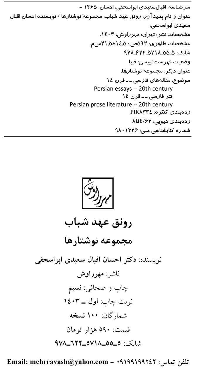 کتاب «رونق عهد شباب» آخرین اثر دکتر احسان اقبال سعیدی، نویسنده، پژوهشگر و روزنامه نگار است که پیش از این نیز کتب قابل توجهی از جمله «مسافر پرواز دمشق» و «اسپرسو با رضا شاه» را به انتشار رسانده است.