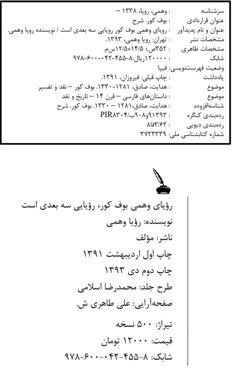 چاپ های قبلی کتاب « رویای وهمی بوف کور، رویایی سه بعدی است » عبارت است از: