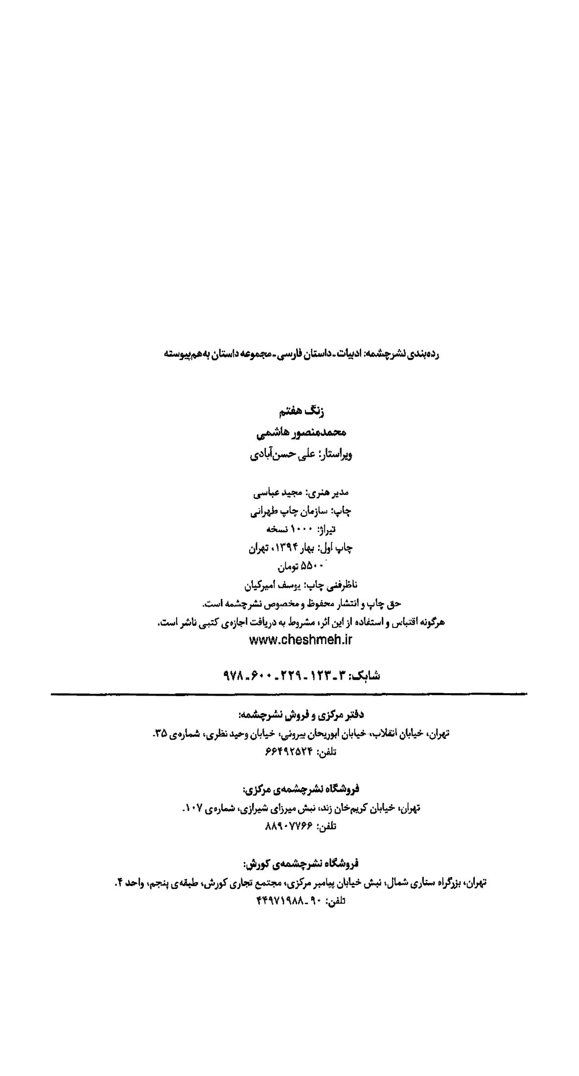 کتاب «زنگ هفتم» اولین مجموعه داستان به‌هم‌پیوسته محمدمنصور هاشمی توسط نشر چشمه منتشر شده است. هاشمی، داستان‌نویس و پژوهشگر ایرانی حوزه فلسفه، ادبیات و دین است که به سرودن شعر نیز پرداخته است. در بخشی از این داستان که شامل هفت داستان کوتاه است،