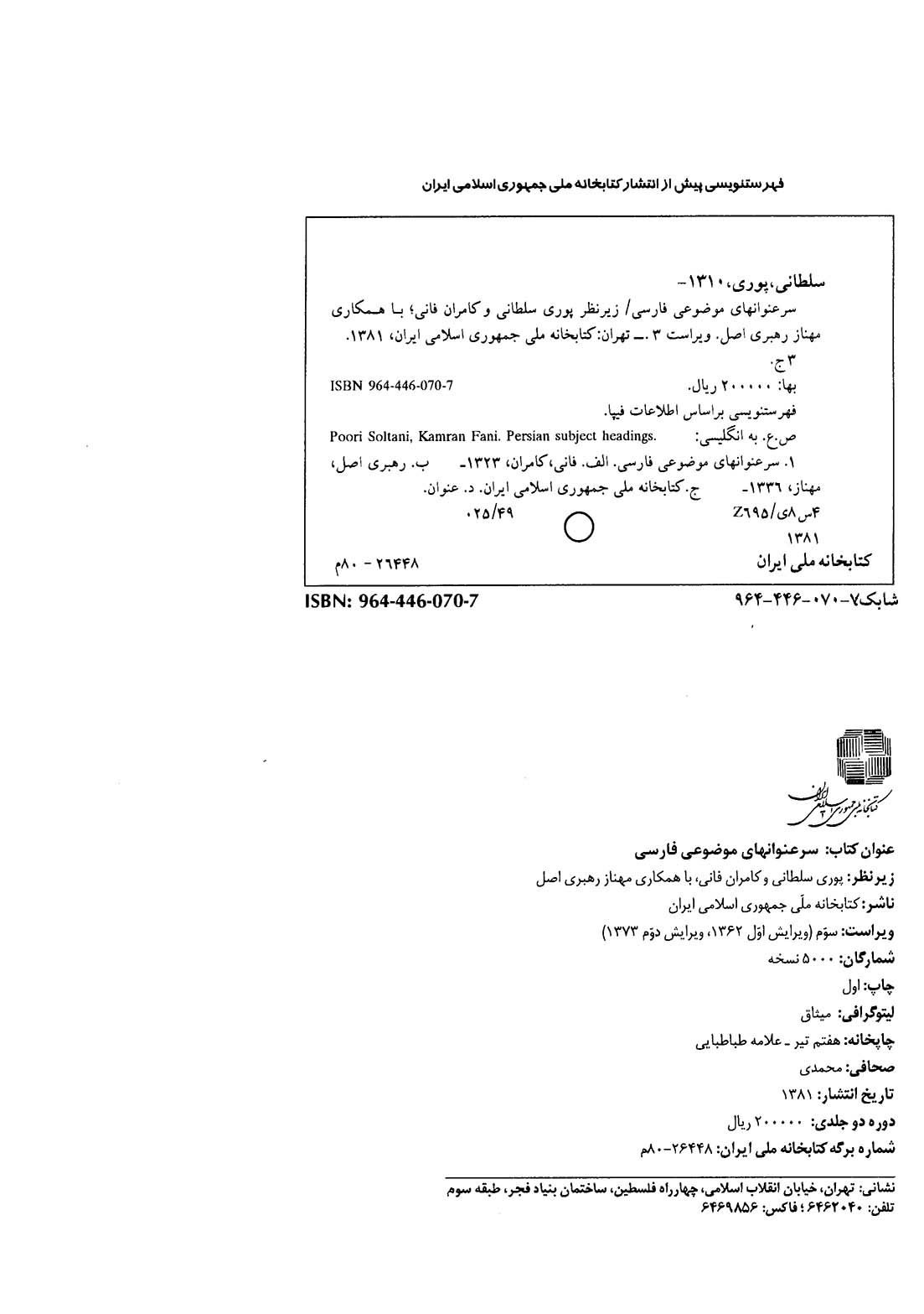 یادداشت پشت جلد به انگلیسی: Poori Soltani, Kamran Fani, Firoozan Zohadi. List of Persian subject headings.