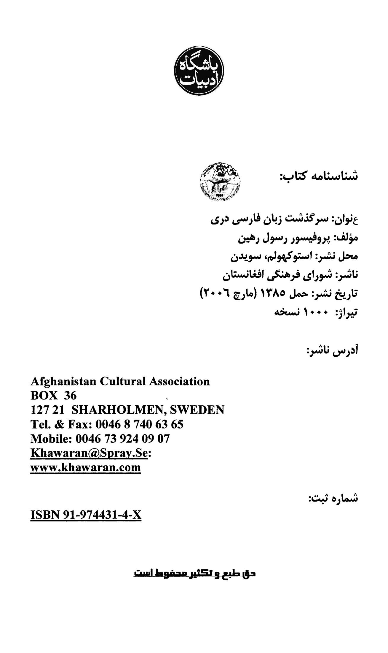 سرگذشت زبان فارسی دری/پروفیسور رسول رهین