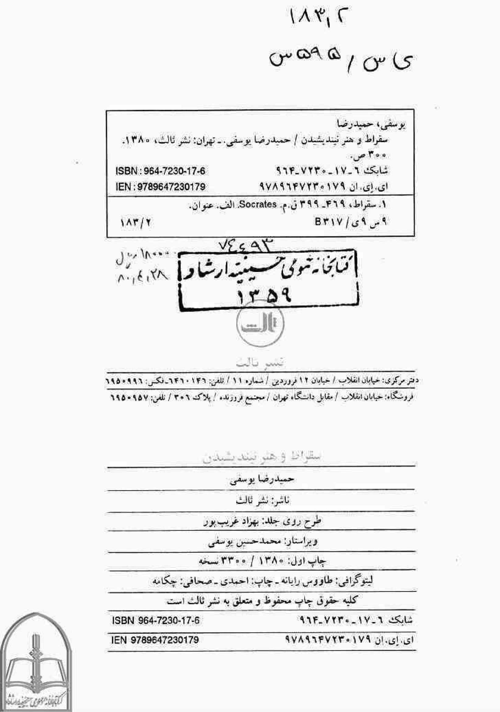 یادداشت پشت جلد به‌انگلیسی‌:Hamid Reza Yousefi. Sokrates.