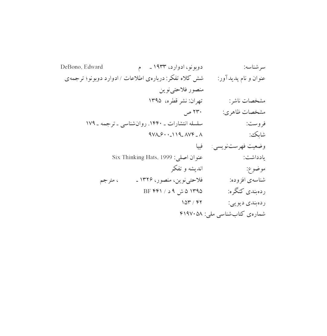 🔖 book_keywords : دانلود فایل pdf شش کلاه تفکر نوشته ادوارد دوبونو ترجمه منصور فلاحتینوین