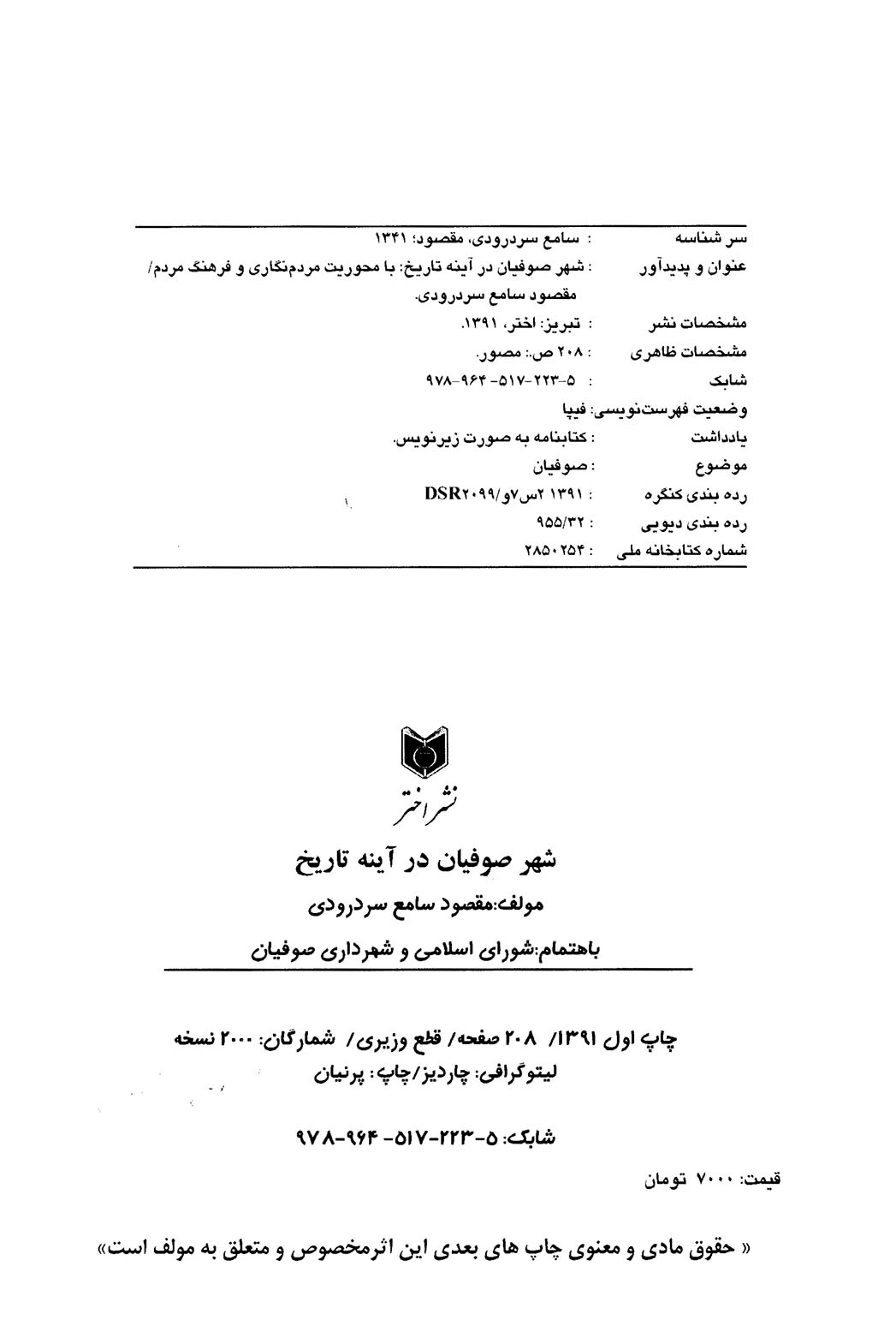 عنوان و نام پدیدآور شهر صوفیان در آینه تاریخ: با محوریت مردم‌نگاری و فرهنگ مردم/ مقصود سامع سردرودی.