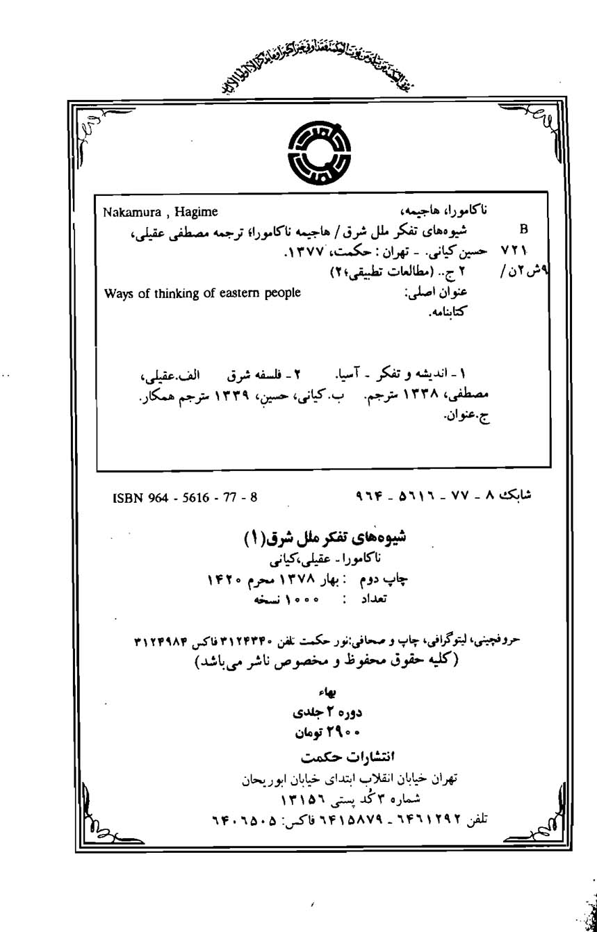 عنوان و نام پدیدآور شیوه‌های تفکر ملل شرق‌/ هاجیمه ناکامورا؛ ترجمه مصطفی عقیلی‌، حسین کیانی‌