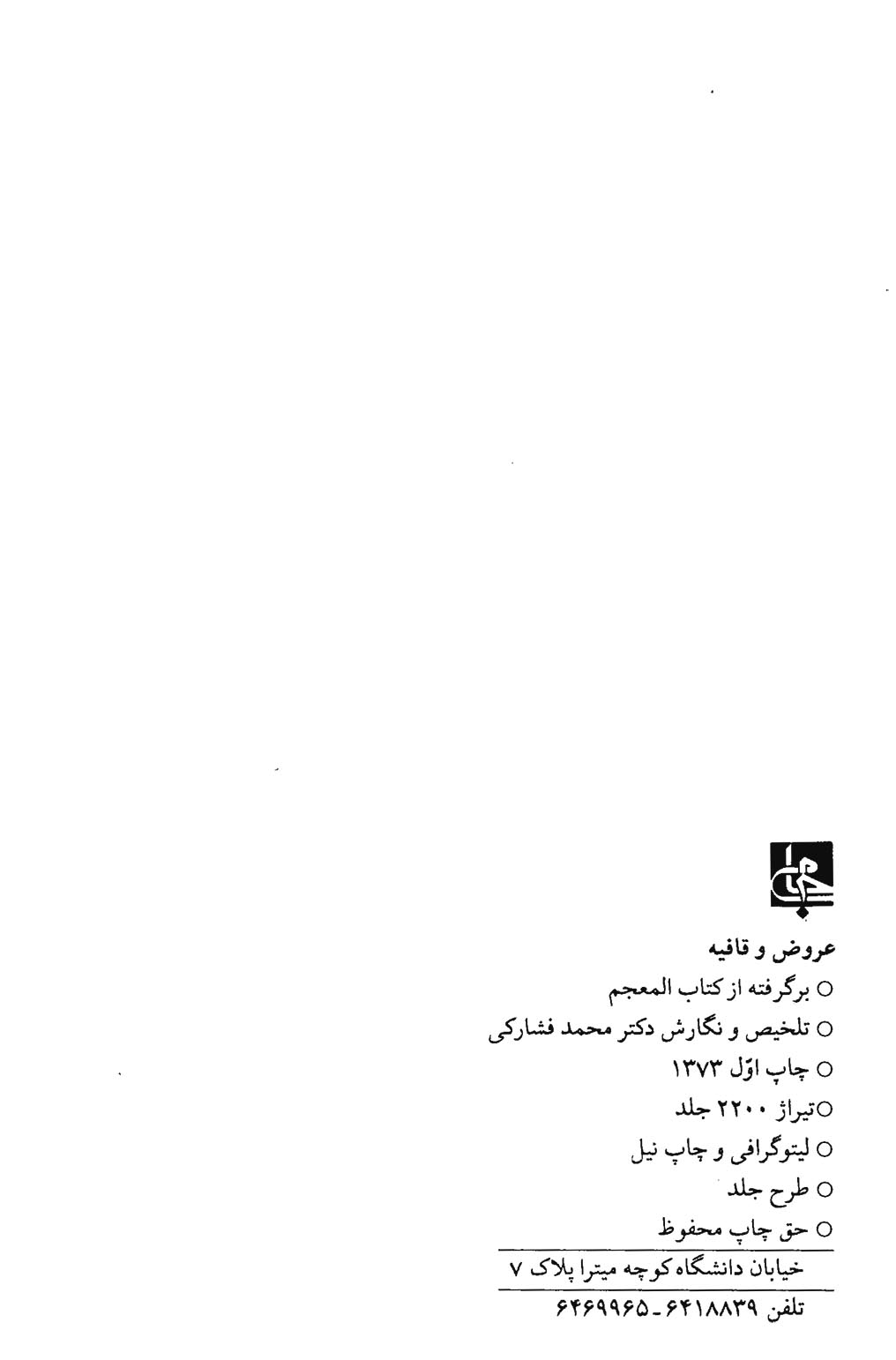 🔖 book_keywords : دانلود فایل pdf عروض و قافیه به زبان ساده (برگرفته از کتاب المعجم) نوشته شمس قیس رازی ترجمه مصحح