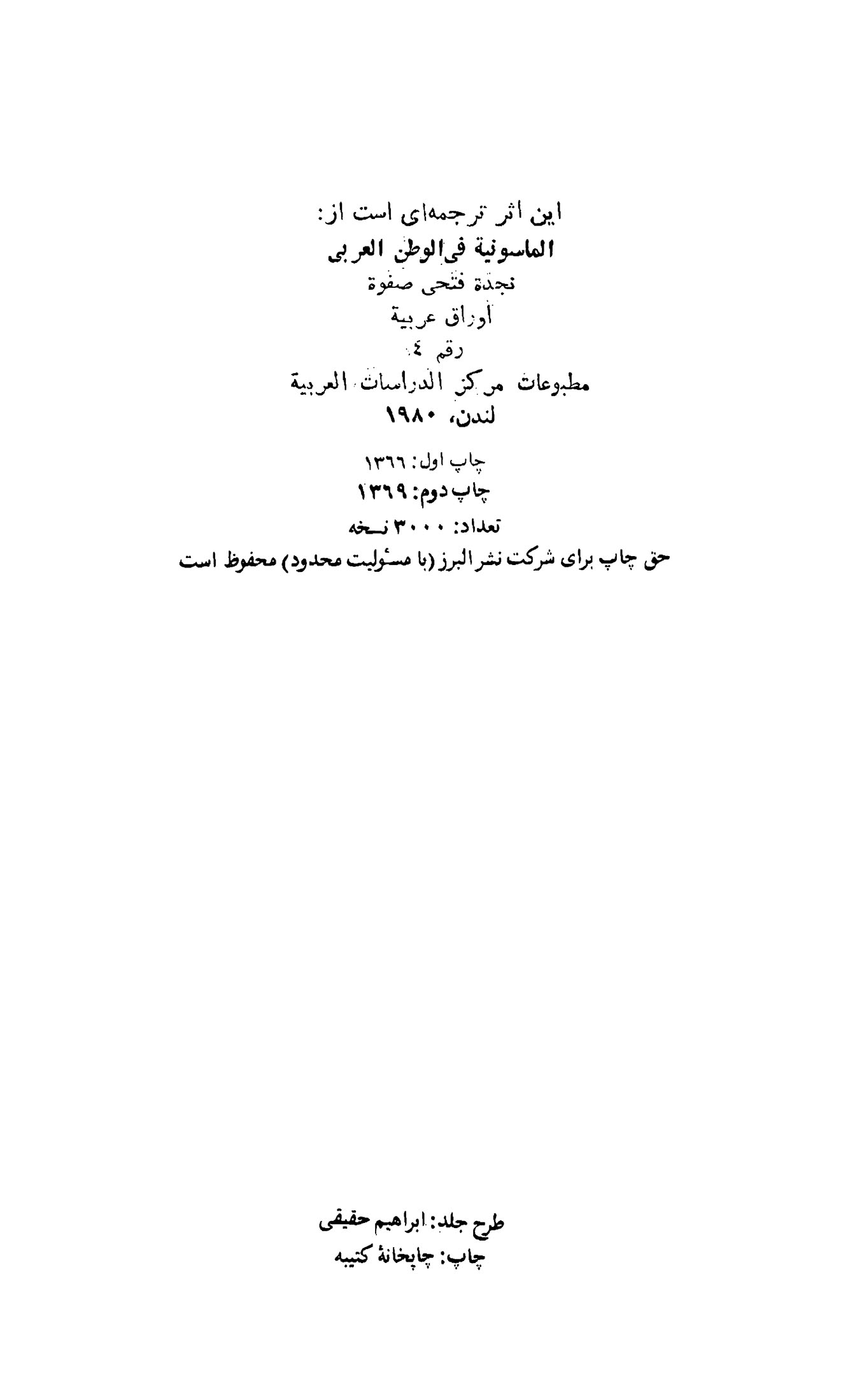 اصل این کتاب به دو زبان عربی و انگلیسی با نام «الماسونیه فی الوطن العربیی» و Freemasonry in the Arab World در یک جلد توسط مرکز پژوهشهای عرب (مرکز الدراسات العربیه) چاپ و منتشر شده است. متن انگلیسی اندکی خلاصه تر از متن عربی مرکز پژوهشهای عرب ( Arab Research Centre) دربرگیرنده شماری از پژوهشگران و کارشناسان امور سیاسی و اقتصادی جهان عرب و از آن میان آقای نجده فتحی صفوت است.
