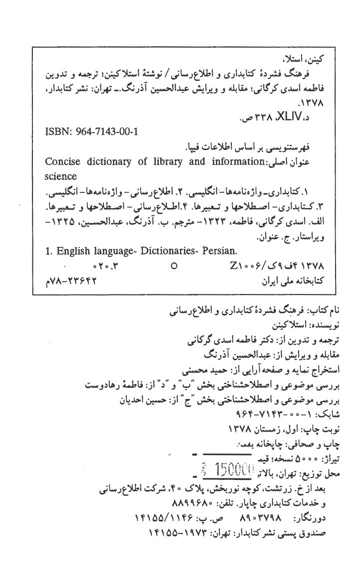 از «فرهنگ فشرده علوم کتابداری و اطلاعرسانی» استلاکینن، ترجمه و تدوین دکتر فاطمه اسدی کرگانی نه تنها برای ترجمه بلکه برای درک بسیاری از مفاهیم کتابداری و اطلاع رسانی و حتی آمادگی برای آزمونهای کتابداری و اطلاع رسانی میتوان استفاده کرد.