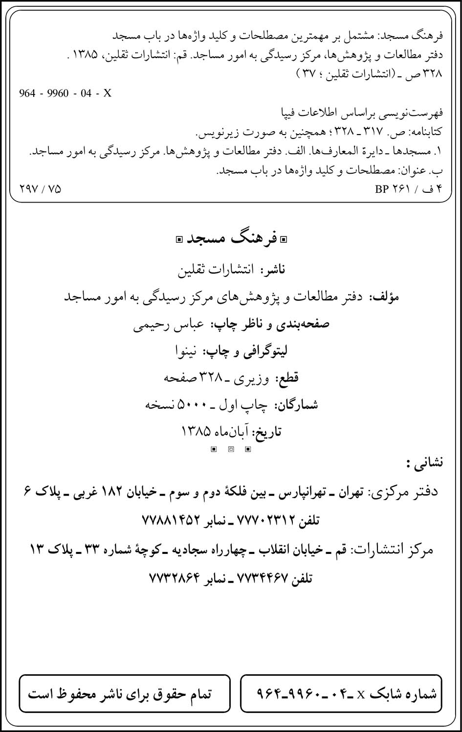 کتاب فرهنگ مسجد، فرهنگ نامه ای تخصصی و با نظم الفبایی است که در آن، عناوین مرتبط با مباحث مسجد، همراه معنا و توضیحات لازم و مستند گرد آمده است