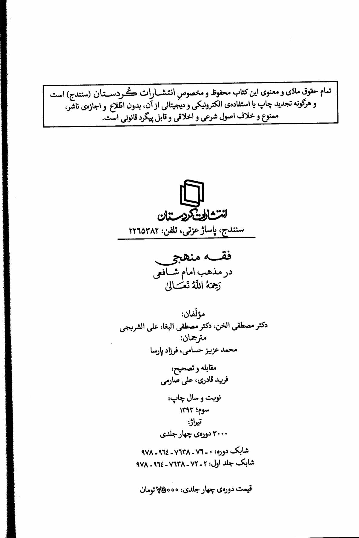 نویسندگان این کتاب ۴جلدی، احکام فقهی را با زبانی بسیار ساده و روان براساس فقه شافعی به نگارش درآوردهاند تا فهم مسائل دینی و احکام برای عموم مردم به آسانی صورت پذیرد.